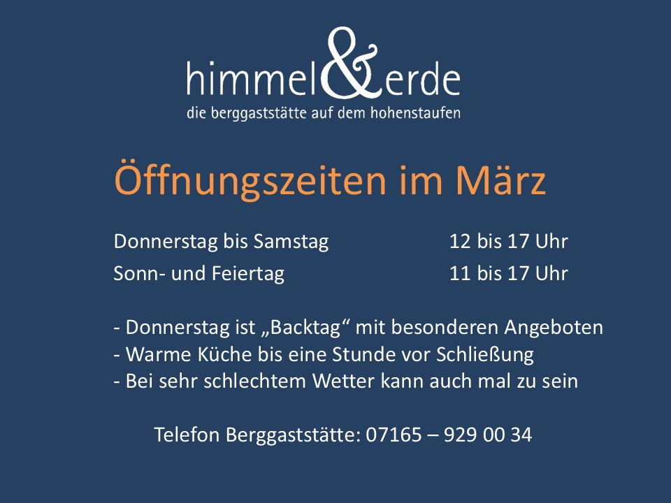 Der Berg Hohenstaufen ist ein einzigartiges Natur- und Geschichtsdenkmal. Der wunderbare Blick auf die Schwäbische Alb entschädigt für den kurzen Fußmarsch auf den Gipfel. In der Berggaststätte „himmel&erde“ erwarten Sie leckere schwäbische Gerichte und Spezialitäten aus den Göppinger Partnerstädten.